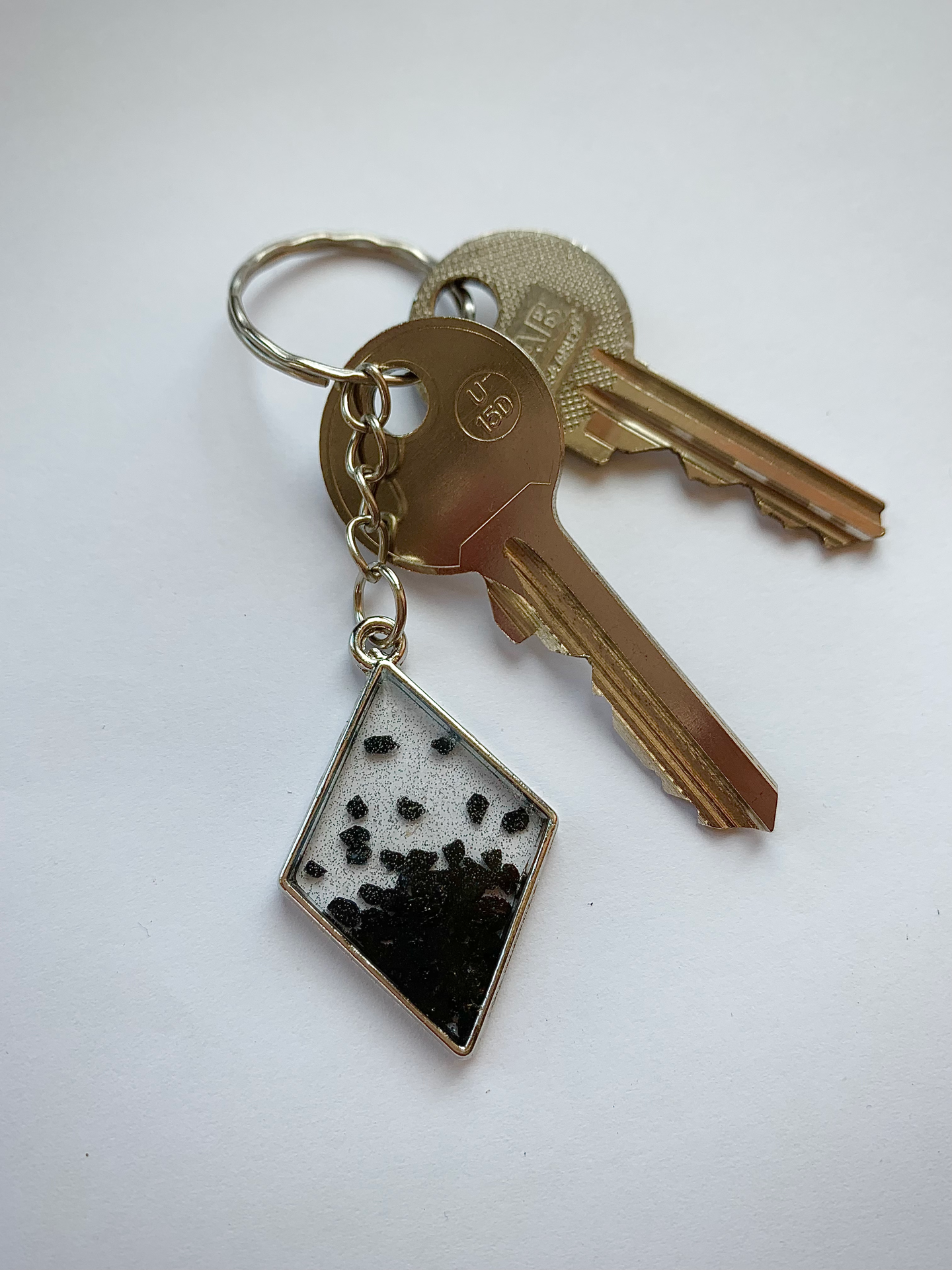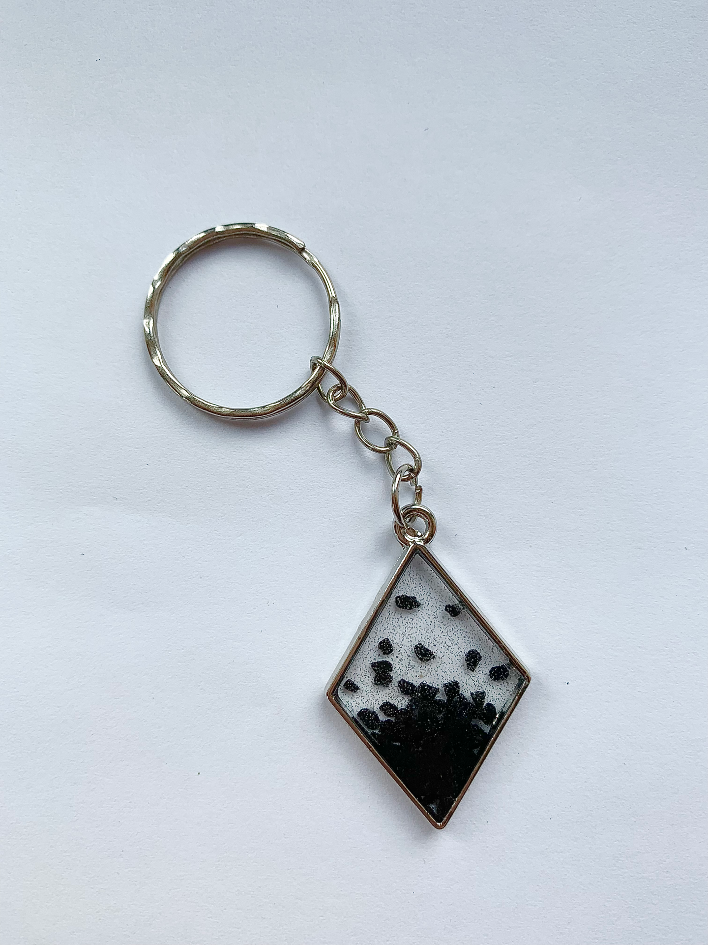 Přívěsek na klíče z pryskyřice s pravými černými kamínky.