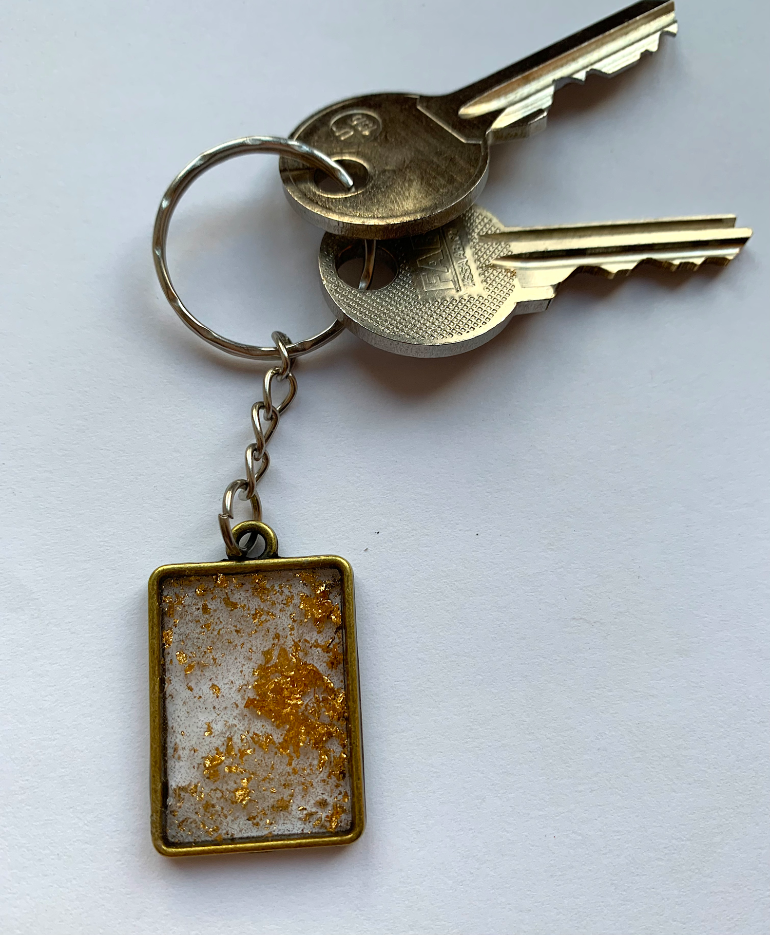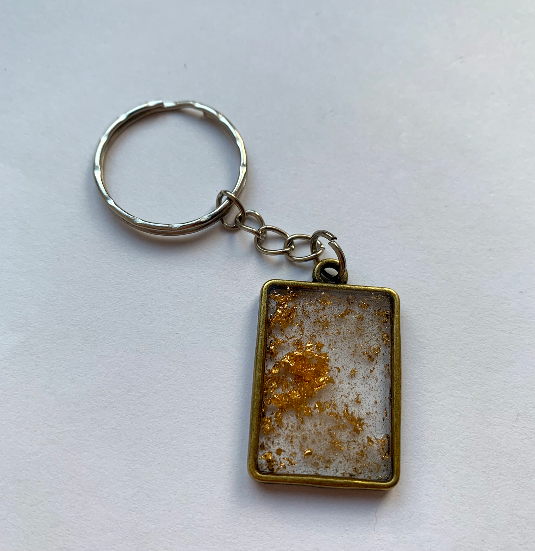 Přívěsek na klíče z pryskyřice se zlatými vločkami.